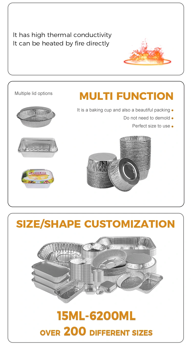 Yunchu aluminiumfolie leverantör kaka bakning kopp silver aluminium folie mat behållare bakning och formning två-i-ett, fleranvändning av aluminiumfoliebehållare, bakning, grill vid utbud av användning, kan vara uppvärmda över öppna flamor och motståndskraftiga mot att baka, istället för krukor, baka butiker, hem, matfunktioner Behöver vikas och formas, snygg användning, en mögel multifunktion, pudding, tårta, äggträder, ångade ägg, grill, etc., anti-stick och lätt att demolda, inte lätt att bränna, smidigt inuti kan släppas med en lätt nypa, öppen flamvärme och inte brytning, det kan förhindra små snacks och choklad från slippning och kan förbättra slipning och en variation av färger.