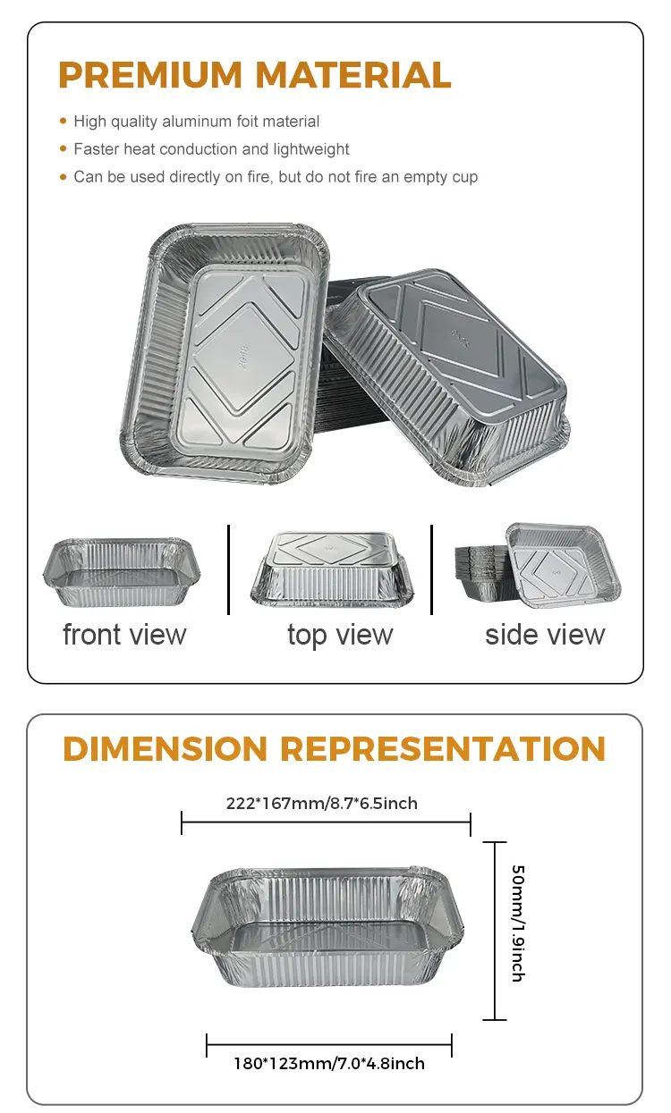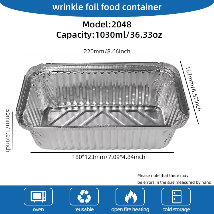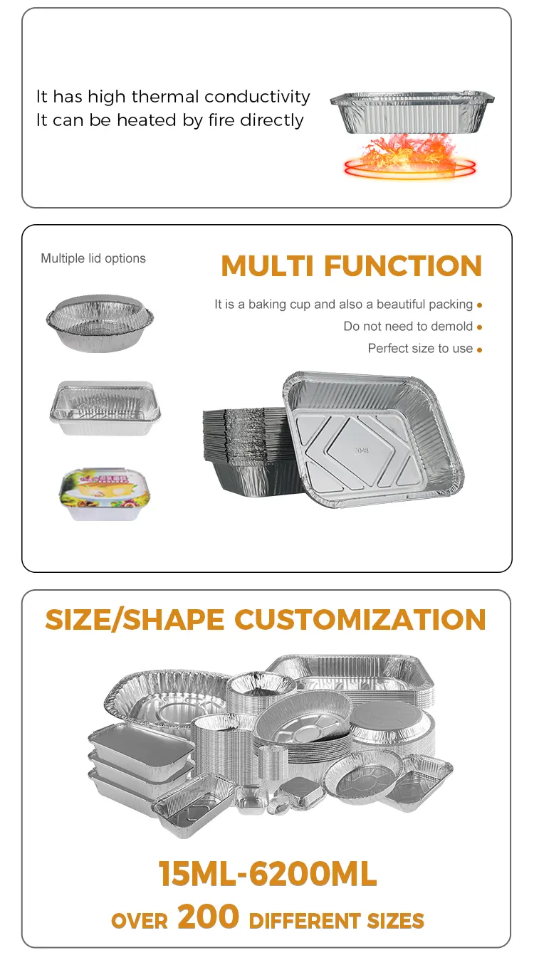 Yunchu Aluminium Foil Factorys engångsmatlåda för grillbakning i silver aluminiumfolie är gjord av hög renhet av livsmedelskvalitet aluminiumfolie. Det är giftfritt och smaklöst, resistent mot hög temperatur och låg temperatur. Smältpunkten är så hög som 250°C. Det kan vara i direkt kontakt med mat. Det släpper inte ut skadliga ämnen vid upphettning vid höga temperaturer. Den kan också bibehålla stabil form när den är kyld och fryst. Det är en engångsdesign och kan slängas efter användning. Inget behov av att lägga tid på att rengöra tallrikar och bakformar, helt avgiftande Det löser det tråkiga problemet med att städa efter måltider, och är särskilt lämplig för scener som sammankomster med många människor och utomhusresor. Det uppgraderade förtjockade aluminiumfoliematerialet har en solid struktur och stark stödförmåga. Det är inte lätt att läcka eller deformeras när man håller rätter med soppor eller tunga grillingredienser. Kanterna är släta och gradfria, vilket gör den säkrare att använda. Den är också lämplig för ugnar, fritöser, ångkokare och andra köksredskap, och tillagning och servering kan göras i ett steg.