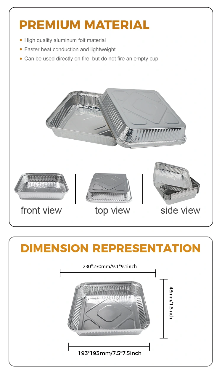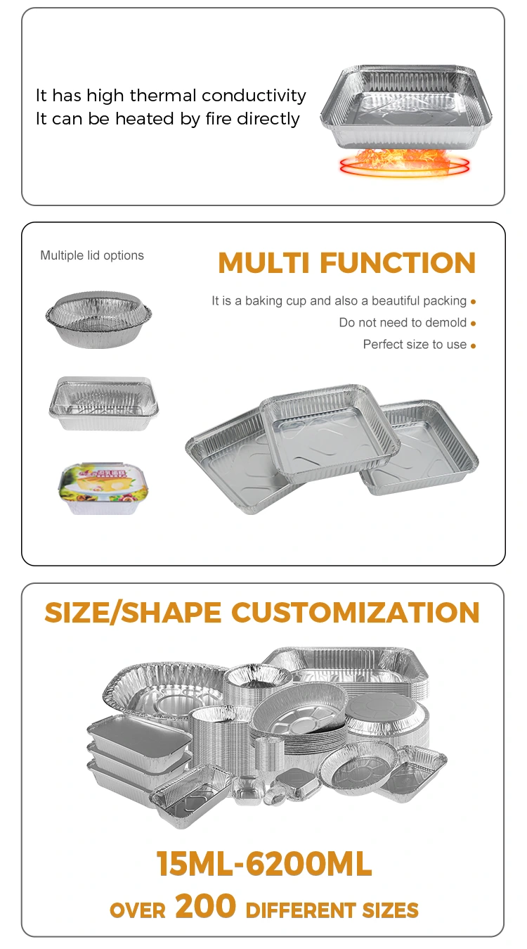 Yunchu Aluminium Foil -leverantör producerar engångsbaks -spettar Silver aluminiumfoliebehållare, som är lämpliga för catering takeaway -beställningar, små kakor i bagerier, familjesnacks och restauranger. Safe and healthy, food ideas are not limited, kitchen utensils are a good partner to easily cook food, air fryers and other equipment are heat-resistant and oil-proof, easy to bake, outdoor barbecue, temporary bowls are not afraid of fire, when using, food or soup needs to be placed, do not dry without water, household oven, clean and convenient, disposable plate, can be thrown away after use without cleaning, the container is integrated into the body, and the Kantsdesign är tankeväckande för att undvika att skrapa händerna. Flera storlekar är tillgängliga för dig att välja mellan för att passa olika användningsscenarier. Om du har några frågor eller behöver mer information, kontakta oss gärna.
