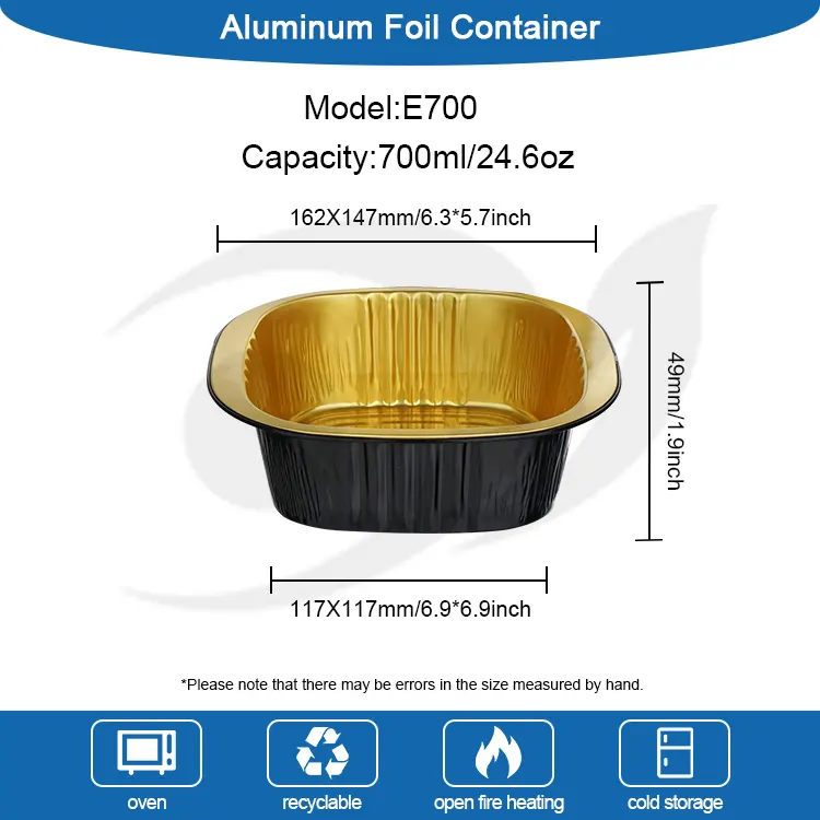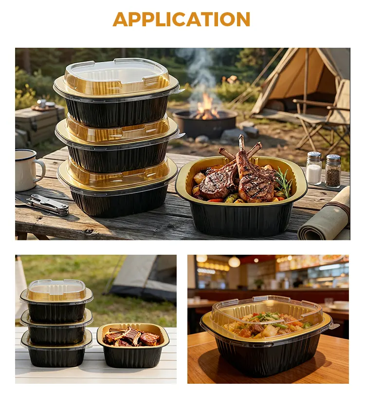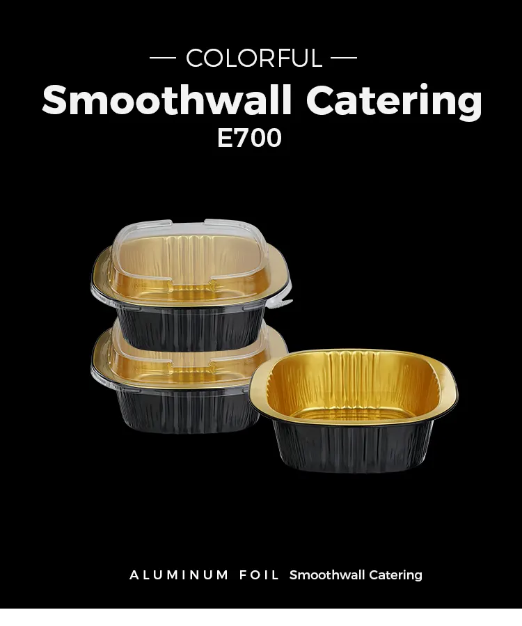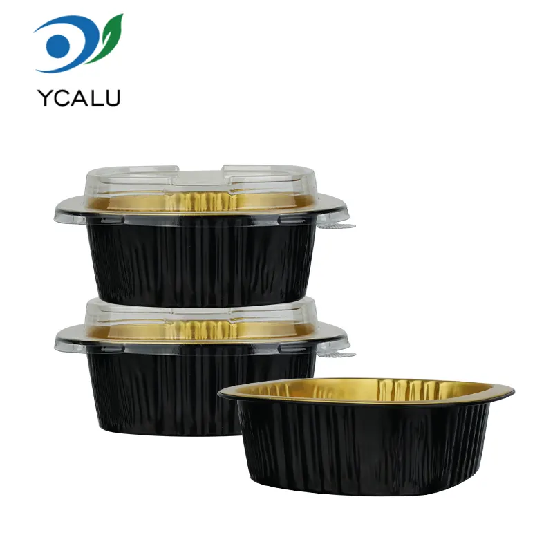 Yunchu aluminiumfolieleverantörs binaural fyrkantiga engångslåda svart guld ljusväggiga aluminiumfoliebehållare är gjorda av livsmedelsklassad 8011 aluminiumlegeringsfolie. De har behandlats med högtemperaturglödgning och steriliseringsprocesser för att bilda ett tätt oxidskikt på ytan. De har inga tungmetaller och ingen lukt. De kan vara i direkt kontakt med alla typer av livsmedel och förhindra utfällning av skadliga ämnen vid höga temperaturer. Oavsett om de används för att hålla varma rätter, kalla rätter, desserter eller såser, kan de skydda livsmedelssäkerheten och uppfylla flera säkerhetscertifieringar som FDA och SGS, vilket gör varje tugga säkrare. Den unika ljusväggdesignen i svart guld bryter den monotona strukturen hos traditionella aluminiumfoliebehållare. Den mattsvarta guldbeläggningen och den släta väggytan ger en exklusiv känsla. Det har inte bara ett enastående utseende, det kan också effektivt blockera ljus och syre, fördröja matens oxidation, låsa fast matens doft och fukt, undvika luktöverföring och behålla matens ursprungliga smak under lång tid. Den släta väggytan har inga spår eller rynkor, vilket gör det mindre benäget att föda bakterier och är lätt att rengöra. Det kan också bättre anpassa sig till anpassning av tryck, vilket hjälper cateringmärken att förbättra deras erkännande och kvalitet.