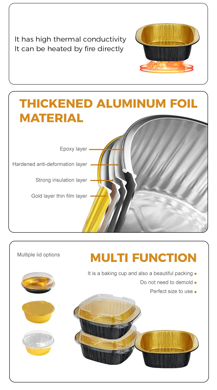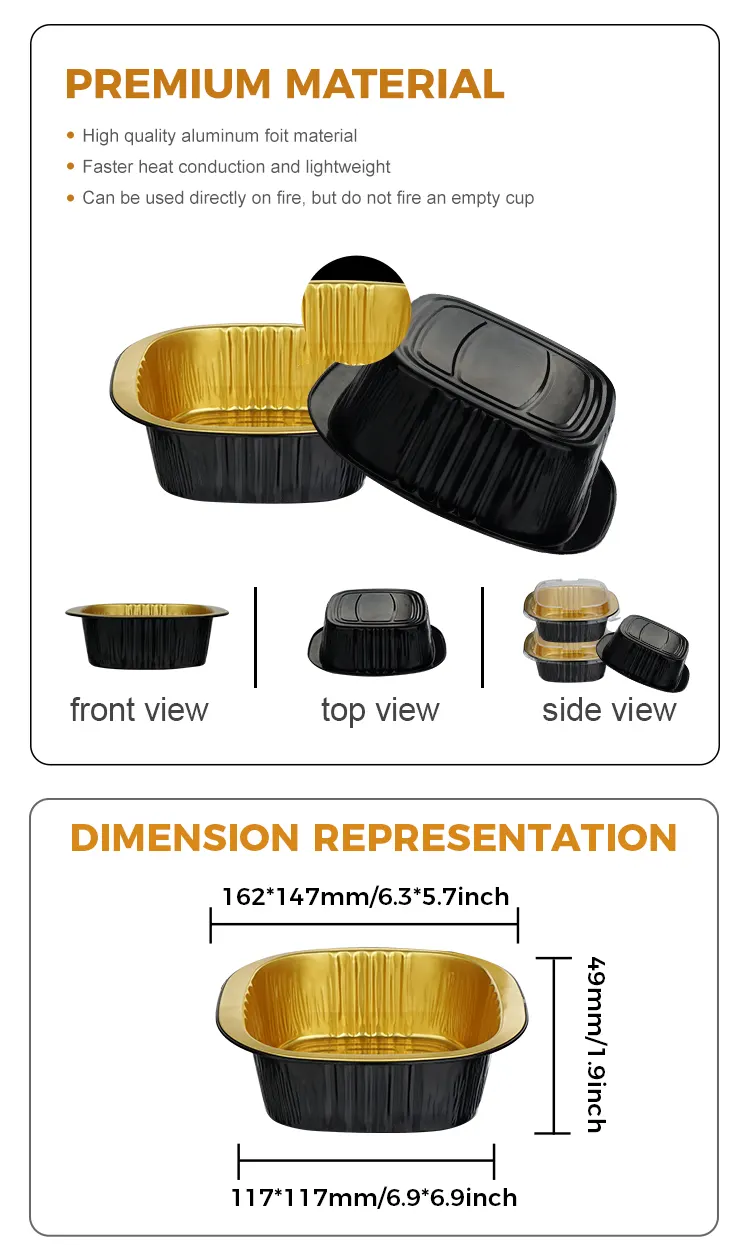 Yunchu Aluminiumfolieleverantörens engångsdubbelöra fyrkantiga låda svart guld ljusväggig aluminiumfoliebehållare har en fyrkantig design, fullt utrymmesutnyttjande, rundade och släta hörn, inga vassa grader och säkrare att använda; genomtänkt design med dubbla öron, ergonomisk, isolerad och mot skållning, lätt att ta, även om den innehåller varma måltider och soppor, kan den lätt hållas för att undvika brännskador på händerna och lösa den obekväma smärtpunkten med traditionella aluminiumfolielådor. Tillverkad av förtjockad aluminiumfolie, den har en solid och tuff textur, stark stödförmåga och är inte lätt att deformeras eller skadas. Den kan hålla mat med soppor och fett utan läckage eller sidoläckageproblem, och dess hållbarhet är vida överlägsen vanliga engångsmatlådor.
