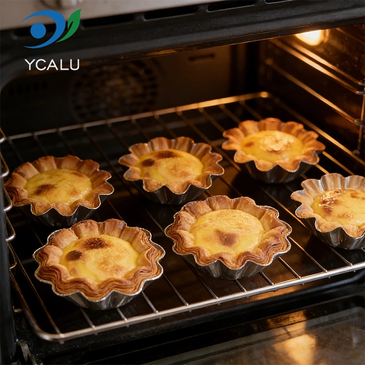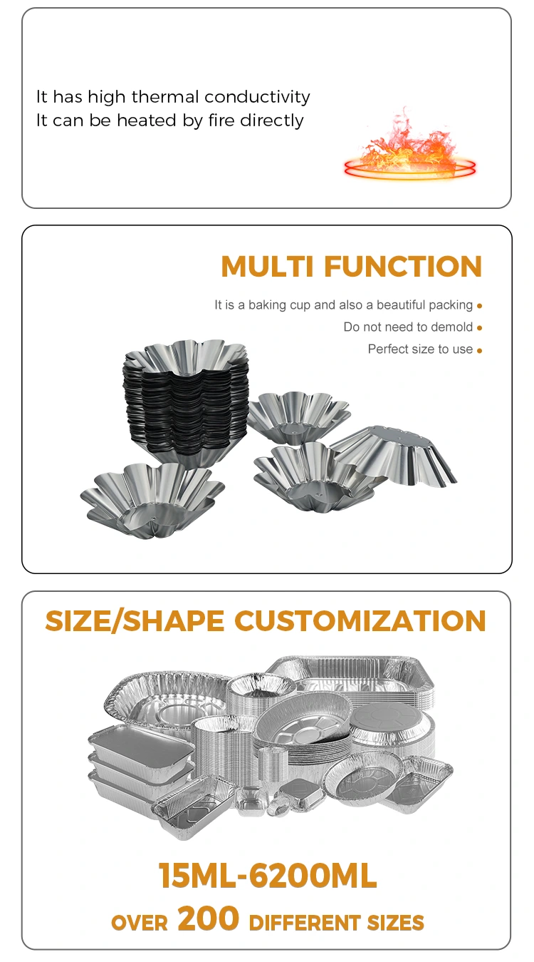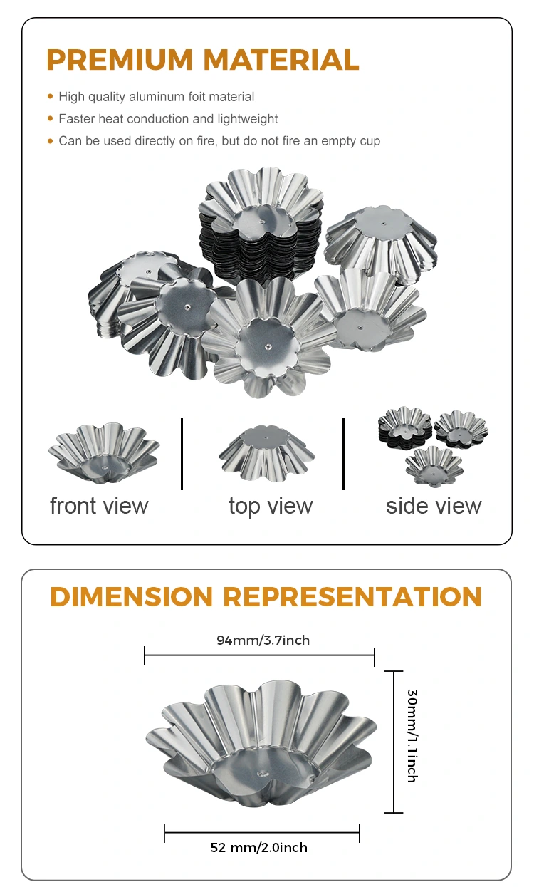 Utomhus och bekväma scener: Lätt och bärbar, lämplig för utomhuscamping, picknick, fester och andra scener. Äggtårtor och snacks kan förberedas i förväg och läggas i behållare utan att bära tunga bakplåtar. De kan kasseras direkt efter att ha ätit. Den är lätt att rengöra och tar ingen plats. Den kan även användas för takeout-förpackningar. Förseglings- och värmekonserveringsegenskaperna hos aluminiumfoliematerialet kan effektivt bibehålla temperaturen och smaken på desserter och undvika läckage och deformation under transport.
