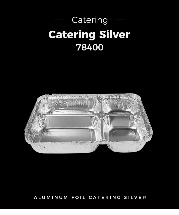 • Engångsuppfald av multi-fack Snabbmat silver aluminiumfoliebehållareEngångsuppfald av multi-fack Snabbmat silver aluminiumfoliebehållare