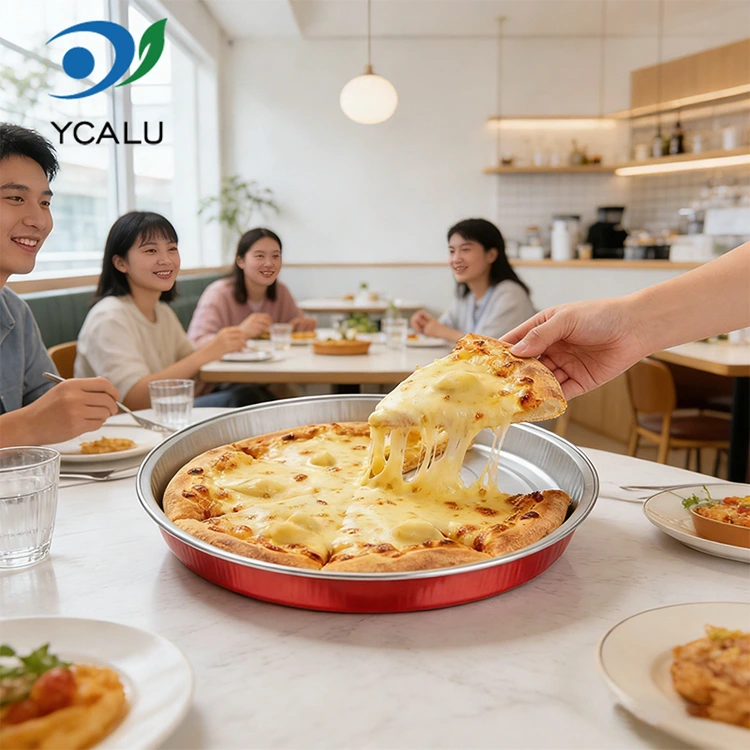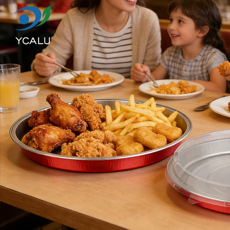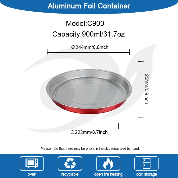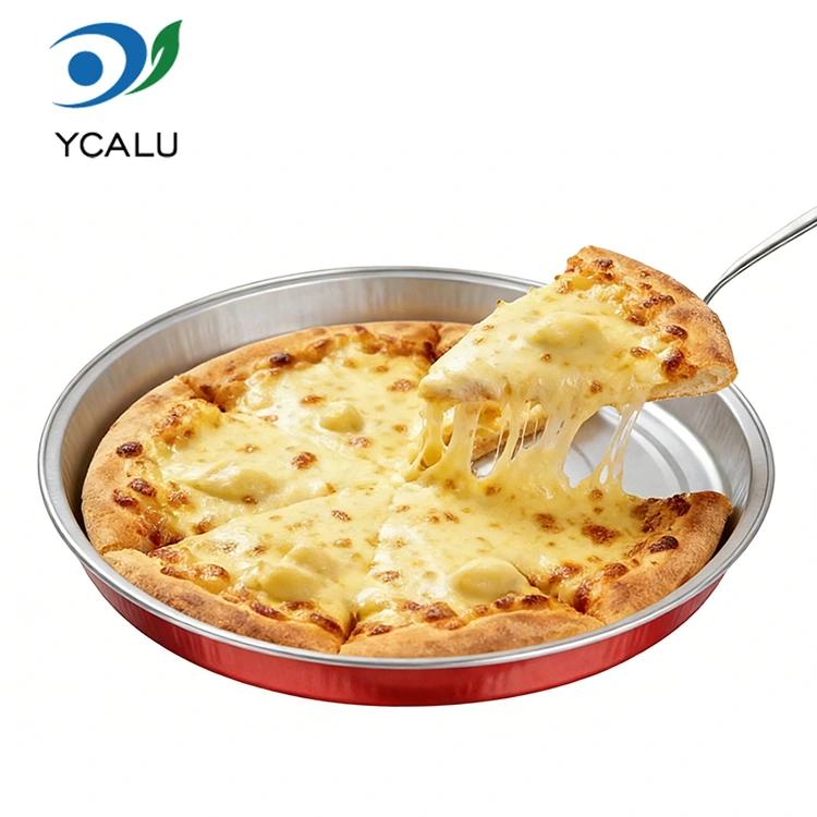 Yunchu aluminiumfolieleverantör C900 engångspizzaförpackning Rund aluminiumfoliebehållare är gjord av livsmedelsklassad rå aluminiumfolie, utan lukt och föroreningar, vilket gör det säkert att röra mat med självförtroende. Tjockleken är enhetlig och solid, och den tål höga temperaturer upp till 250°C och låga temperaturer ner till -20°C. Nyvarm pizza kan serveras direkt. Den kan kylas och hållas fräsch utan att byta behållare. Det kan ätas direkt genom uppvärmning, vilket avsevärt förbättrar effektiviteten av matleveransen och sparar besväret med rengöring. PET-höljet av aluminiumfolie blockerar effektivt inträngning av vattenånga och luft och förhindrar fettläckage. Den klassiska runda bågen passar exakt alla typer av pizzaformer, med flera storlekar tillgängliga från 7 till 9 tum. Den är perfekt lämpad för olika specifikationer som handgjord pizza, italiensk pizza och amerikansk tjock skorpa. Det finns inget extra utrymme för att förhindra att pizzan glider och pålägg faller av. Formningsprocessen i ett stycke skapar en stabil form, är motståndskraftig mot tryck och kollision och deformeras inte lätt eller skadas under transport. Den kan också behålla sin form när den staplas och förvaras, vilket helt löser smärtpunkten med lätt skadade avhämtningsförpackningar och säkerställer att varje pizza levereras i gott skick.