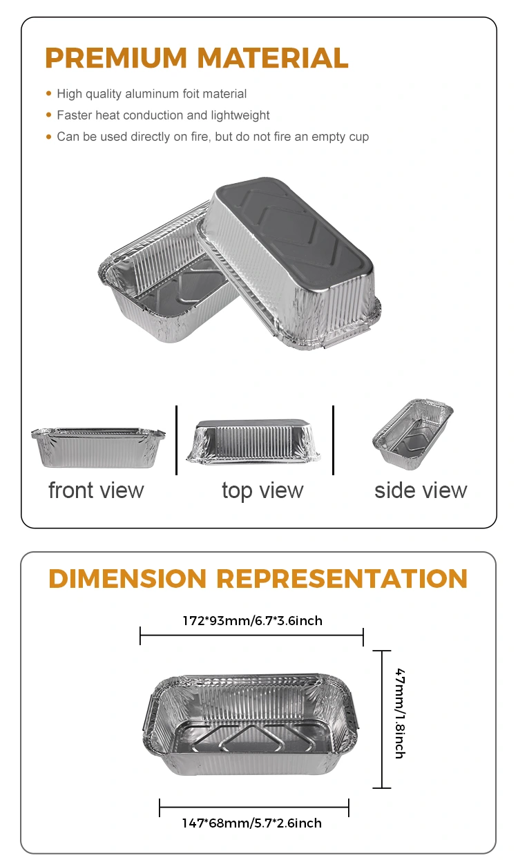 Yunchu aluminum foil supplier's Disposable rectangular baking Silver Aluminum Foil Containers, long-lasting baking resistance, open flame available, upgraded heightened design, prevent dirty pot walls, heightened design, prevent soup from flowing out, food is not easy to stick, easier to take, smooth edges are used without cutting hands, inward folding edges prevent cutting hands, details are treated carefully, direct contact with the container, can be used as Ätbara containrar, engångsanvändning är orofri och rengöring, och det finns inget behov av att rengöra det när det används, bekvämt och hygieniskt. Använd smutsiga aluminiumfolieboxar har också ett visst återvinningsvärde, när det gäller kvalitetskontroll, vi övervakar strikt varje produktionssteg för att säkerställa att alla produkter uppfyller nationella säkerhetsstandarder. Företaget har erhållit säkerhetscertifikatet för livsmedelsförpackningsmaterial för aluminium som utfärdats av staten och har passerat den tyska ERP -certifieringen, EU SGS -certifiering och ISO9001 -certifiering.