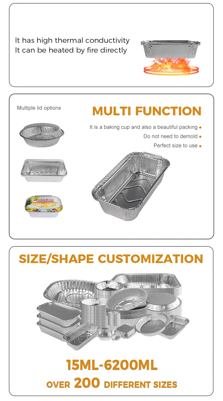 De disponibla rektangulära bakning av silver aluminiumfoliebehållare från Yunchu Aluminium Foil -leverantör är ett mångsidigt köksverktyg som är lämpligt för olika matlagningsmetoder som grillning, varm kruka, gratin, takeaway -förpackningar och mer. Denna behållare är tillräckligt kompakt för att passa en mängd krukor och utrustning och finns i olika storlekar för att tillgodose behoven hos olika öppna flamgrillar. Det kan användas för att tillverka olika livsmedelsprodukter, såsom luftrum och annan utrustningsapplikationer, värme och oljemotstånd, enkel bakning.