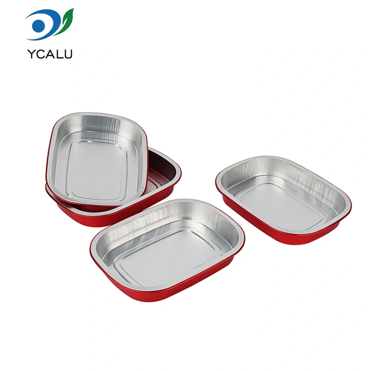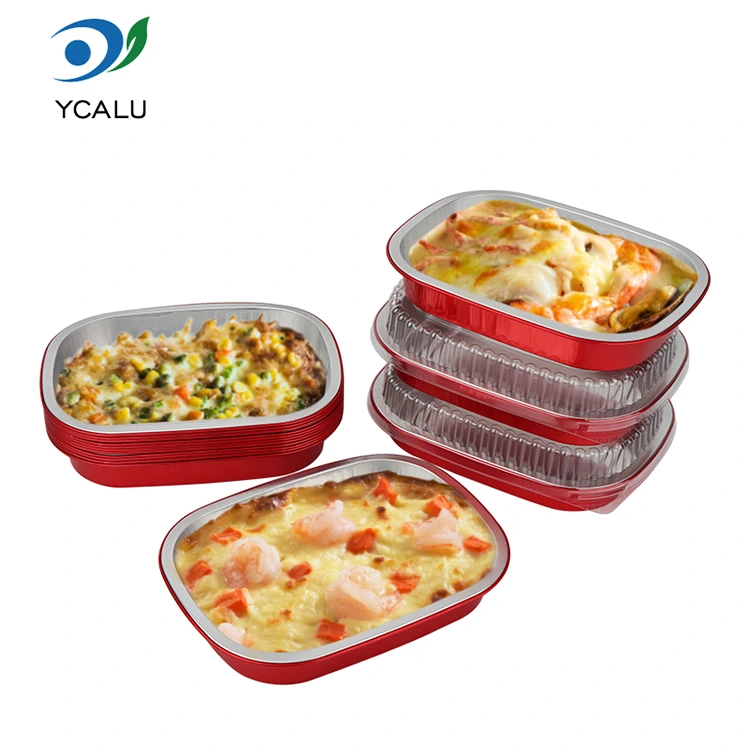 Bagerier och västerländska restauranger kan använda röda engångsmatlådor fyrkantiga aluminiumfoliebehållare för att sälja grillade durianer, bakad sötpotatis och grillade köttfat. Den gyllene konsistensen förhöjer produktkvaliteten. Kunderna kan värma och äta dem direkt utan extra plätering. Mathandlare för avhämtning använder den för att leverera bakat ris, grillade kycklingvingar och andra rätter. Aluminiumfolien låser temperatur och fräschör. Redan en timme efter leverans förblir maten varm och soppan läcker inte.