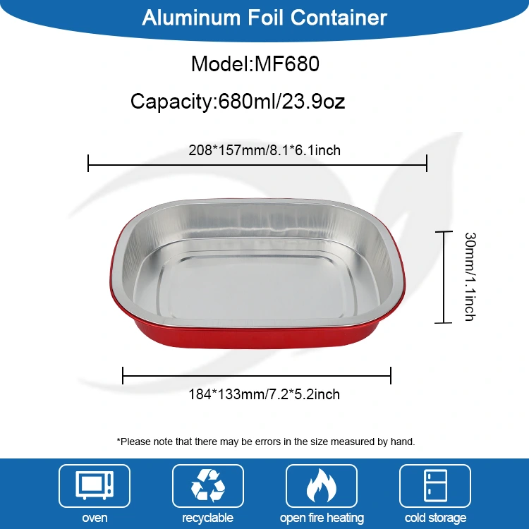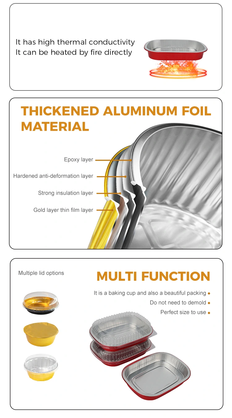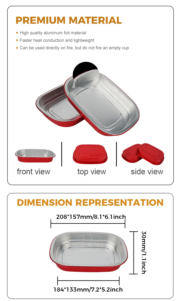 Yunchu är en professionell tillverkare och leverantör av aluminiumfoliebehållare i Kina. De röda engångsmatlådan fyrkantiga aluminiumfoliebehållare vi tillhandahåller för dig har en diameter på 208*157 millimeter (8,1*6,1 tum). Den nedre diametern är 184*133 (7,2*5,2 tum), höjden är 30 (1,1 tum) och kapaciteten är cirka 680 milliliter (23,9 OZ). Den använder livsmedelsklassat 8011 livsmedelsklassat aluminiumfolie förtjockat basmaterial, som tar hänsyn till både seghet och belastningskapacitet, är inte lätt att deformera eller läcka och kan direkt stödja mat. Den är kompatibel med ett ultrabrett temperaturområde på -20℃ till 220℃. Ingen urtagning krävs. Den kan sättas in direkt i ugnen, fritösen eller ångkokaren för användning, och kan även kylas för konservering. Det erbjuder en enkel upplevelse av "bakning - förvaring - konsumtion - kassering". Huvudfördelen med aluminiumfolie är dess höga värmeledningsförmåga. Den gyllene beläggningen hjälper till att samla värme, vilket säkerställer att maten värms jämnt och snabbt.