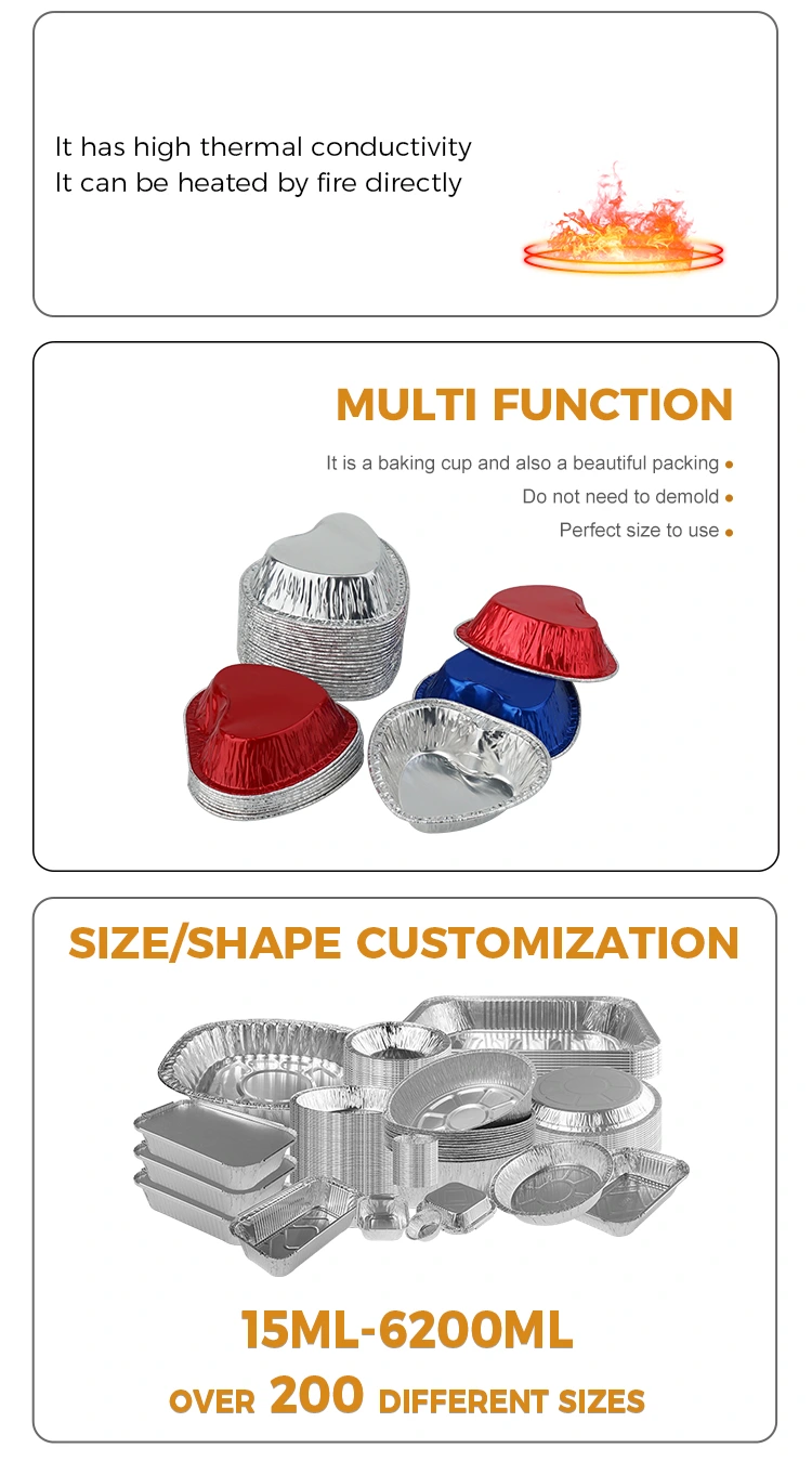 Yunchu aluminiumfolieleverantörens hjärtformade luftfritös silveraluminiumfoliebehållare är lämplig för flera scener. Denna hjärtformade aluminiumfoliebehållare är praktisk och anpassningsbar till en mängd olika livsscener, och täcker dina tre måltider om dagen och din fritid.