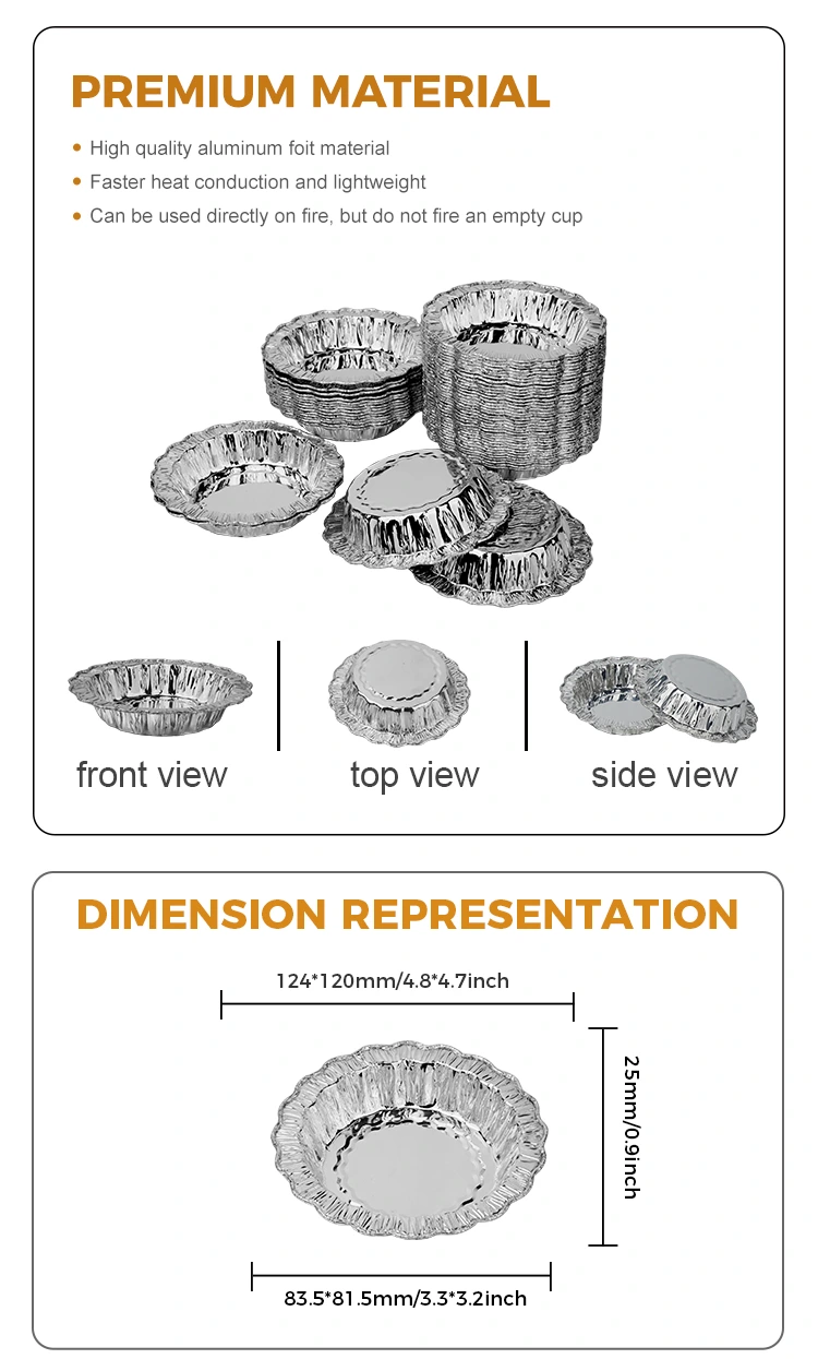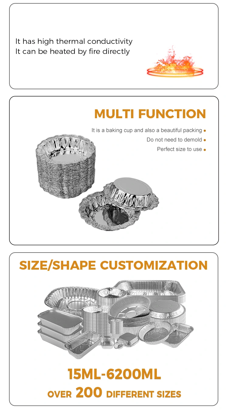Yunchu aluminiumfolie ger dig spetsar rund bakning av tårta silver aluminiumfoliebehållare är mångsidiga för bakning och ång. Den är designad för flera användningsområden, som kan tillverka kakor, skålkakor och olika andra delikatesser. Det är engångsbehov, inget behov av rengöring och tål höga temperaturer från -30 ℃ till 250 ℃, inte bränner eller bryter. Tillverkad av tjocka, högkvalitativa, livsmedelskvalitet och miljövänliga material är det säkrare att använda utan skadliga ämnen. Det är motståndskraftigt mot skador, robust och hållbar, med stark draghållfasthet och god förlängning, medan kanterna är släta för att undvika snitt. Det finns olika specifikationer tillgängliga för att möta olika bakbehov.