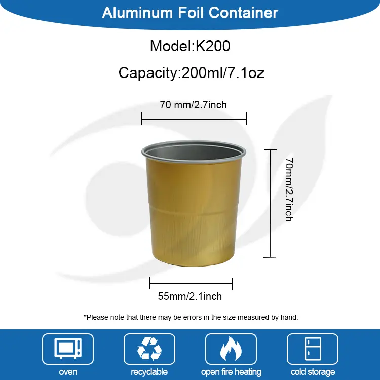 Yunchu aluminiumfolieförsörjningsfabriksmodell K120 Engångs camping kaffedrickkopp, övre diameter 60 mm (2,3 tum), lägre diameter 48 mm (1,8 tum), höjd 63 mm (2,3 tum). Mängden är cirka 120 ml (4,2 oz), denna engångs camping kaffekopp används i en mängd kommersiella, camping, familjemottagning, etc., med ett vackert och elegant liv, praktiskt och högvärdes utsmyckningsliv, för att vara en smakfull person, denna produkt har ett tjockt skikt för att göra värmen jämnt spridd.