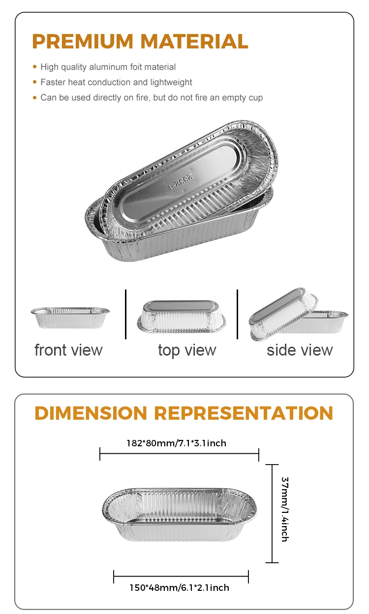 Yunchu aluminiumfolieleverantör Oval Air Fryer Baking Silver aluminiumfoliebehållare är en typ av behållare som kan användas för ångande, kokande, bakning, bakning och andra ändamål och kan användas för såser, doppande såser, små fördelar och bakprovprover. 8011-0 Typ av aluminiumfolie, dragbeständighet och korrosionsbeständighet har god förlängning, förtjockat aluminiumfolie, hållbar och inte lätt att bryta vid vilja, hemming, främre och bakre halvcirkeldesign skadar inte händer, integrerad formning, väggytan är lika slät som en spegel, rik storlek som är lämplig för användning i en mängd olika scenar.