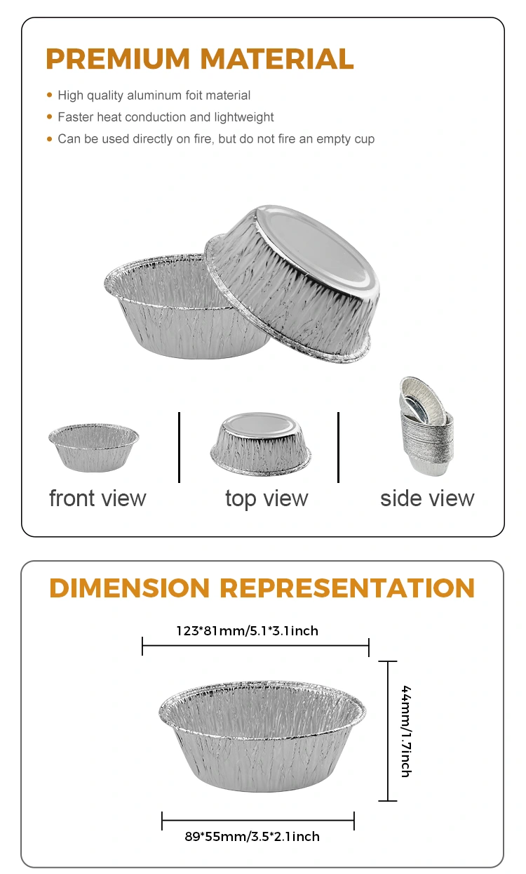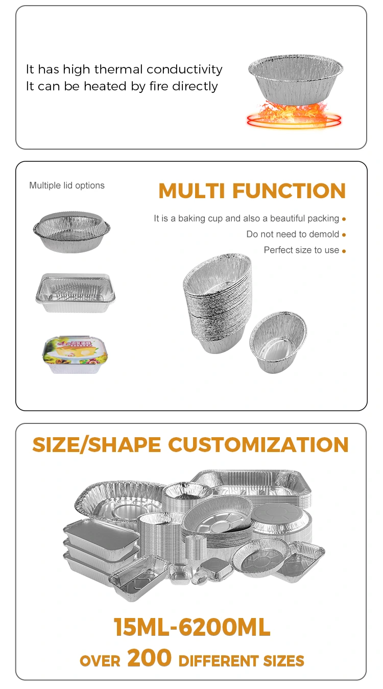 Yunchu aluminiumfolie Leverantör oval ångad kaka silver aluminium folie mat behållare modell 6225 är en aluminiumfolie behållare som kan användas för kommersiellt och hushållsbruk, som kan låsa upp mer användningar, såsom bakade ägg, bakade ostron, äggtarter, kakor, etc., och kan också användas som sås, som, doppar, små drifter och baking-smaker, äggstoppar, kakor, etc., och kan också användas som sås, doppar, små drift Material, integrerad gjutning, väggen är lika slät som en spegel, som är både vacker och praktisk, den hemmande designen skadar inte dina händer, och en mängd olika specifikationer och storlekar uppfyller dina olika behov.