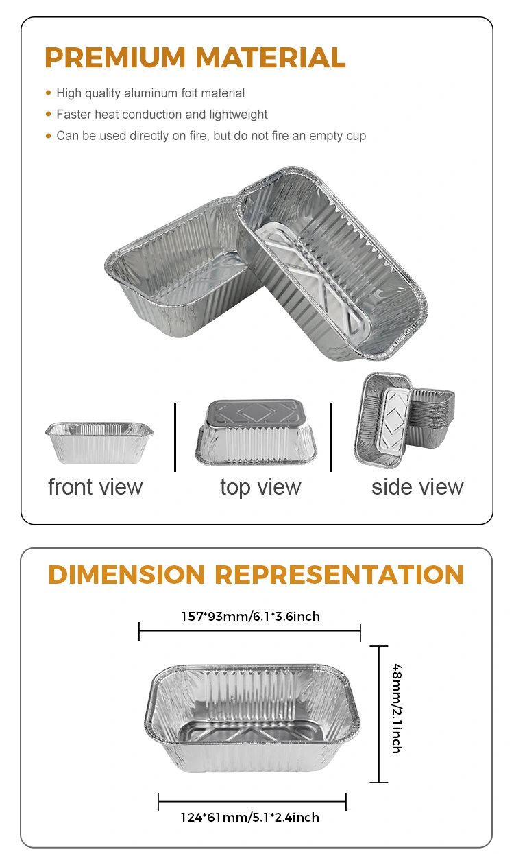 Yunchu aluminiumfolie leverantörens rektangulära luft fryer grill silver aluminiumfolie containrar är lämpliga för olika tillfällen som luft fryer, bakning, catering takeaway, fester och självbetjäningsplatser. Det kan användas för att tillverka matvaror som fyrkantigt bröd, bakade kakor, grillar och luftfryare och kan användas med en mängd olika matvaror. Med en kapacitet på 450 ml kan denna behållare hålla de flesta matvaror och levereras med en helt transparent husdjursfolie -lock för att effektivt förhindra damm och andra föroreningar från att komma in. De släta ytterväggarna gör det enkelt att stapla och förvara och spara utrymme. Det är säkert och hälsosamt att använda, och det är mycket miljövänligt, och materialet är återvinningsbart, vilket gör det enkelt att bära och återanvända.