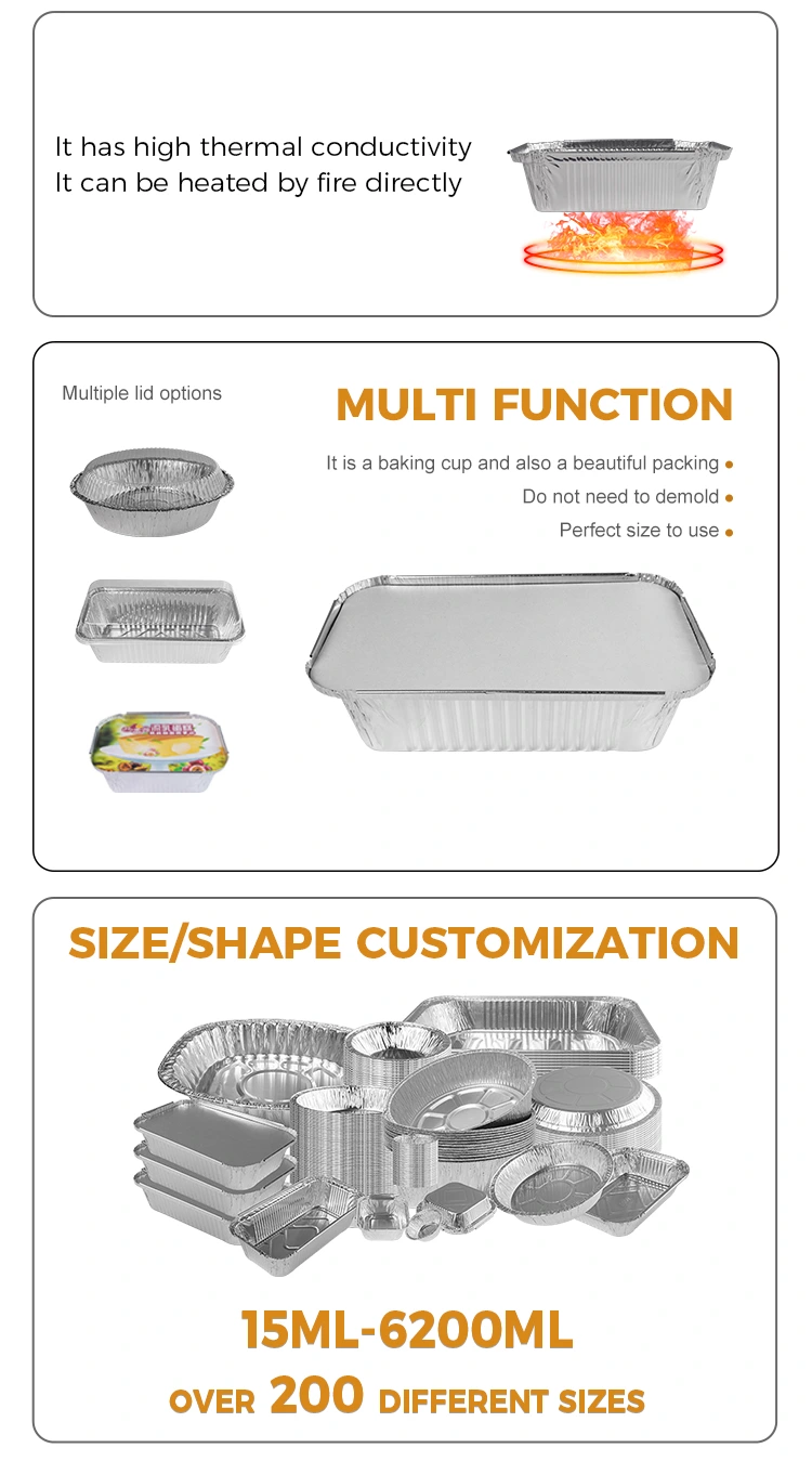 Yunchu aluminiumfolieleverantör tillhandahåller inte bara rektangulär luft fryer förpackning av silveraluminiumfoliebehållare, utan lanserar också en mängd andra förpackningsprodukter för att tillgodose olika marknadsbehov. Till exempel erbjuder de också runda silveraluminiumfoliebehållare, som har vunnit marknaden med sin unika runda design och moderna touch. Dessutom har Yunchu -leverantörer också lanserat en serie aluminiumfoliebehållare i olika storlekar och former för att passa olika cateringscenarier och personliga behov.