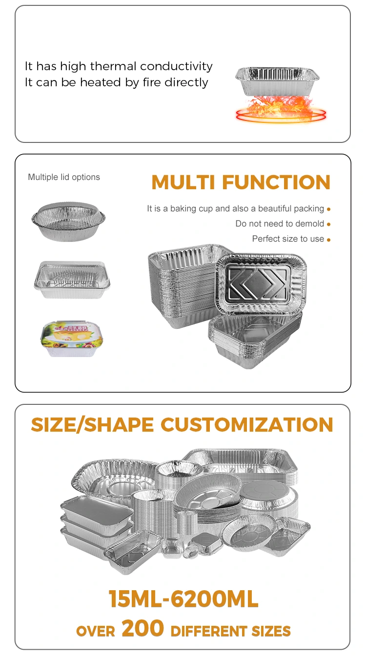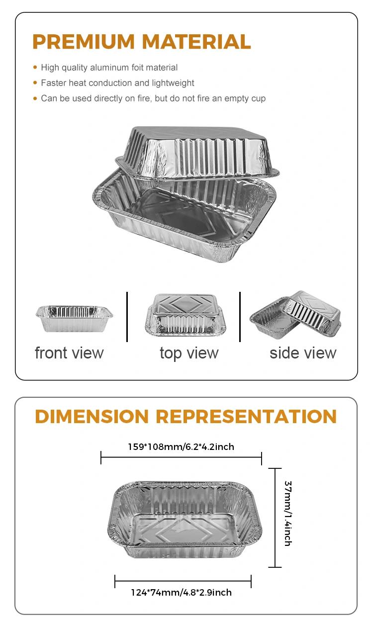 Den 2322 rektangulära bakpannan silverfoliebehållaren från Yunchu aluminiumfolieleverantör tillverkas med livsmedelskvalitetsaluminiumfolie, vilket säkerställer matens säkerhet och luktfria natur. Produkten är renfri och återvinningsbar, vilket ger dig mer sinnesfrid när du använder den. Den har dimensioner på 159 mm (6,2 tum) och 108 mm (4,2 tum) övre diametrar, 124 mm (4,8 tum) och 74 mm (2,9 tum) nedre diametrar, 37 mm (1,4 tum) hög och en kapacitet på cirka 400 ml (14,1 oz). Aluminiumfolieboxar har utmärkta värmebevarandefunktioner, särskilt lämpliga för temperaturkontroll i takeaway och köpcentrum, oavsett om det är små kakor eller fruktmaterial.