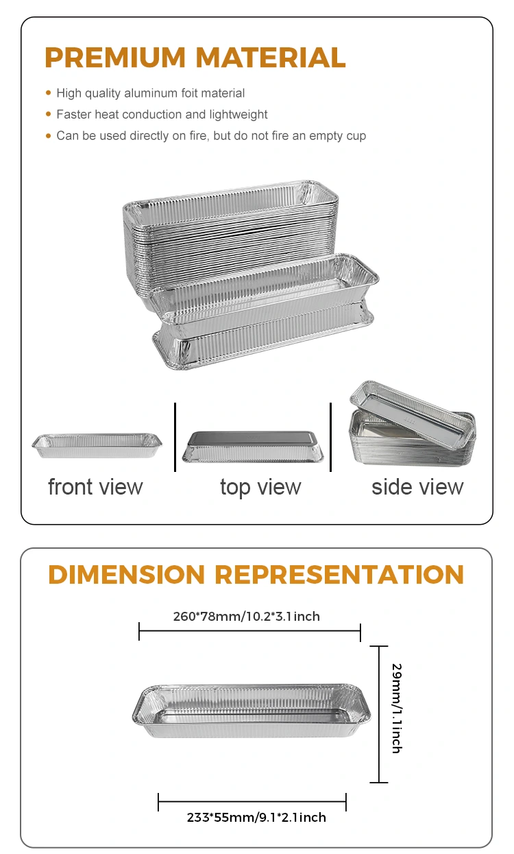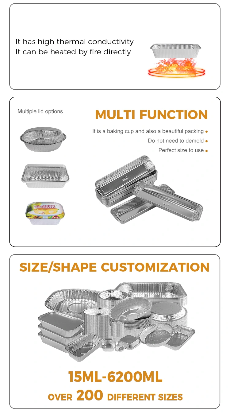 Funktioner: Lunch Box grossist är tillverkad av 8011 aluminiumfoliematerial, som har en god värmebevarande effekt och kan bibehålla matens temperatur, vilket gör maten mer läcker och läckra. Dessutom har vår rektangulära BBQ silver aluminiumfoliebehållare också en värmeisoleringsfunktion och kan matchas med aluminiumfolie lock och PET -plastlock.