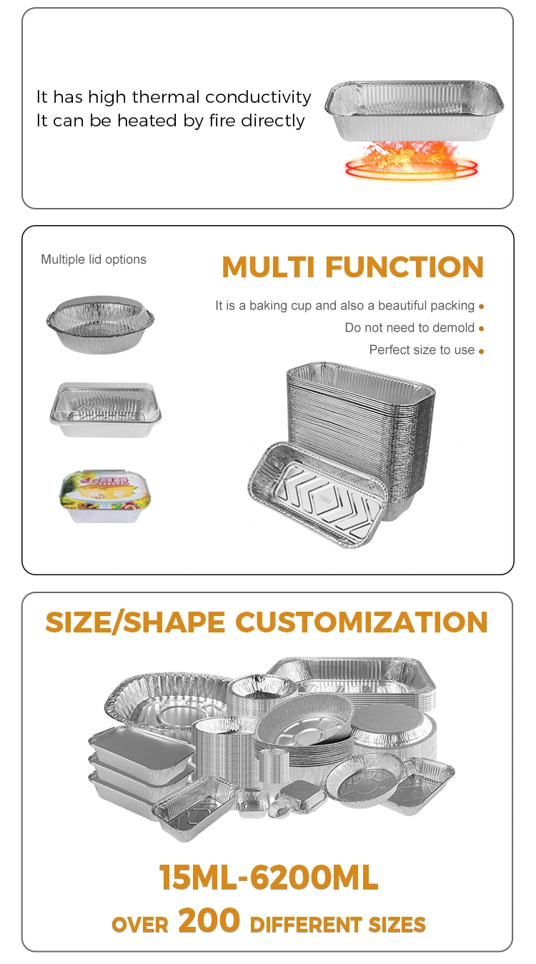 Funktioner: Lunch Box Wholesale 8011 ALUMINIUMFOIL MATERIAL är tillverkat av god värmebevarande, som kan bibehålla temperaturen på maten och göra maten mer utsökt. Dessutom har vår rektangulära grillsilver aluminiumfoliebehållare också en värmebevarande funktion, som kan matchas med aluminiumfolie papperslock och PET -plastlock, vilket är bekvämt för dig att anpassa din logotyp, ytterligare fördjupa kundintryck och förbättra din varumärkesbild.