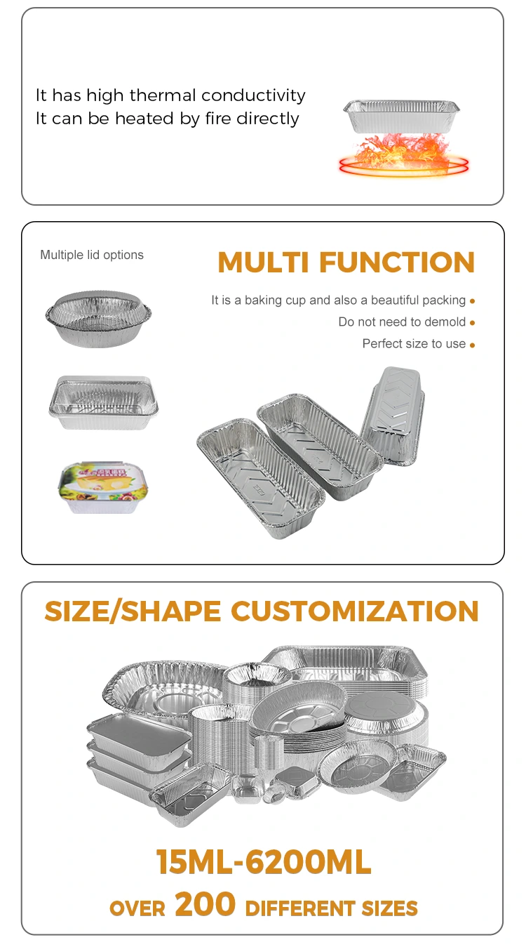 De rektangulära brödet Bakning av silveraluminiumfoliebehållare som tillhandahålls av Yunchu Aluminium Foil -leverantör finns i olika storlekar och specifikationer, lämpliga för alla typer av pottutrustning. Oavsett om det är en stor grill eller en liten hemugn, kan den hantera den med lätthet. Den finns i olika storlekar och kan tillgodose behoven hos olika öppna flamgrillar, oavsett om det är en utomhusgrill eller en tillfällig användning som maträtt, det kommer inte att vara några problem.