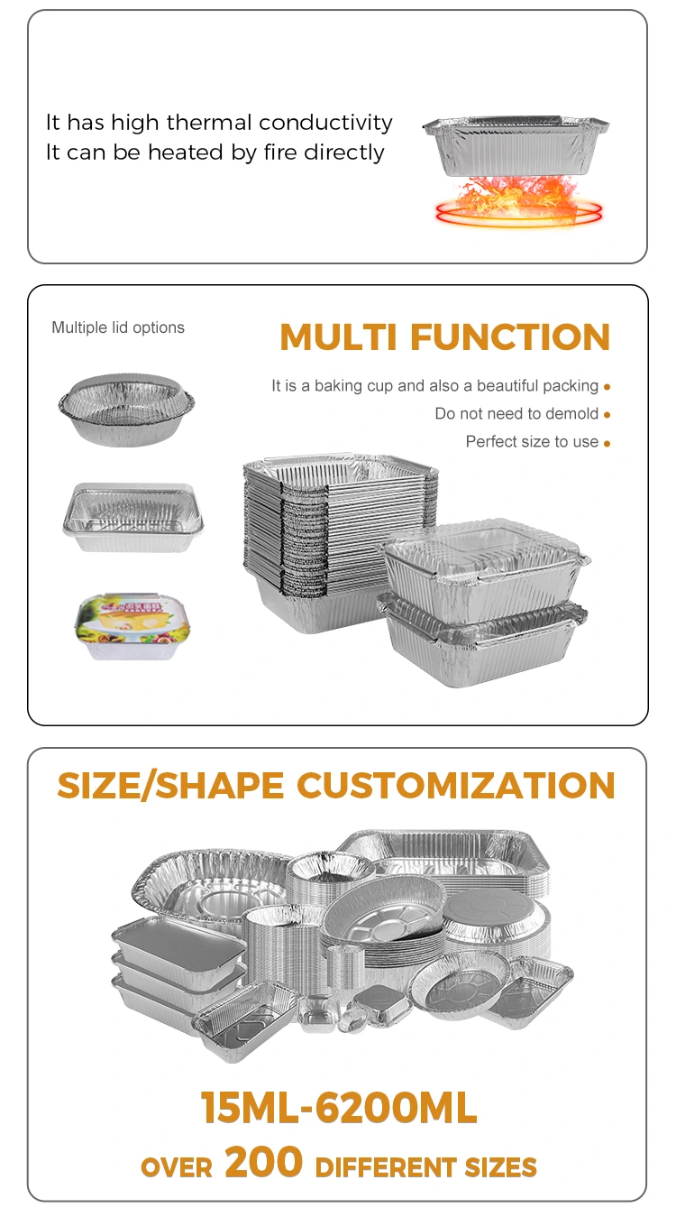 The Made in China Model 2056 Rectangular gratin is packaged Silver Aluminum Foil Containers is a very modest size, with a top diameter of 170*136 mm (6.9*5.3 inches), a base diameter of 131*101 mm (5.1*3.9 inches), a height of only 47 mm (1.8 inches), and a capacity of 620 ml (21.8 oz). Denna storlek är inte bara lätt att bära, utan uppfyller också en mängd olika användningsbehov.