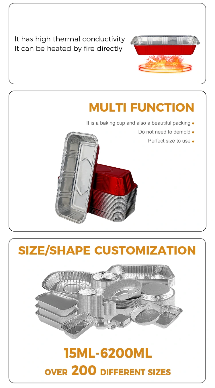 YunChu aluminiumfolies rektangulära röda bageri catering Silver aluminiumfoliebehållare bakas utan oljeborstning, lätt att ta ur formen och undvik att fastna på bakplåten; Vid förvaring skär brödet och packa det i lådor. Efter kylning är det mindre sannolikt att det absorberar smaker. Den är lätt och varm när den tas ut. Vi har även lagt till en funktion som kan värmas på hög värme i en mikrovågsugn, vilket gör den bekvämare för dig att använda. Bageriet kan använda det kommersiellt. Silveraluminiumfolielådan har en enkel metallisk struktur och kan direkt användas som förpackningsbehållare för färdiga produkter. Efter att ha skrivit ut varumärkets logotyp, produktionsdatum och lagringsmetod kan det inte bara förlänga brödets färskhetsperiod (1-2 dagar längre än vanliga plastpåsar vid rumstemperatur), utan också förbättra produktens igenkänning och locka konsumenter att köpa. Under tiden kan aluminiumfolielådorna staplas för förvaring, vilket sparar lagringsutrymme för bageriet. När du tar ut dem behöver du inte packa upp dem separat, vilket snabbar upp serveringseffektiviteten. För bufféscenarier kan värmebevarande egenskapen hos aluminiumfolielådan hålla brödet varmt på matbordet (med en temperaturfluktuation på högst 5 ℃ inom 2 timmar), vilket undviker upprepad uppvärmning som kan göra att texturen blir torr och hård. Den individuella boxdesignen gör det bekvämt för gästerna att ta vid behov, vilket minskar hygienrisker som orsakas av upprepade beröring med tång. Det kan också bromsa oxidationshastigheten för bröd som exponeras för luften och minska avfallet.