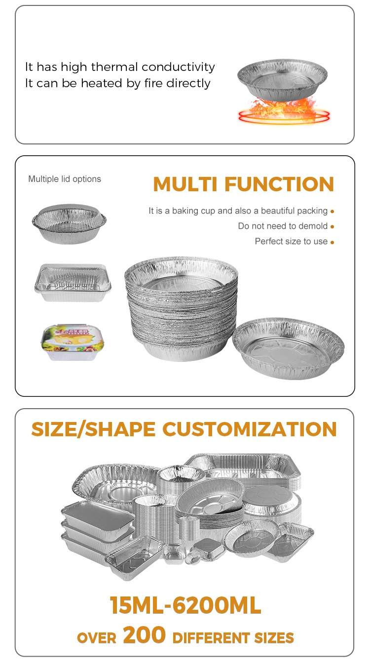 Yunchu Aluminum Foil Supplier Production Wholesale Round air fryer oven Silver Aluminum Foil Containers Design Exquisite, Lightweight and Practical, The weight is about 10.23 grams, easy to stack and store into the cabinet, save space, smooth surface, the pleated texture of this aluminum foil container gives the container strong friction and stable gripping force, the edge is high, but smooth and does not cut the hand, various styles finns tillgängliga, olika storlekar kan väljas, hög temperaturbakning har ingen speciell lukt, det är mycket lämpligt för stora stormarknader för märkning och skanningsarbete efter matbearbetning, dess kapacitet är rymlig, tillräckligt för att hålla alla typer av dagliga mat och snacks, för att tillgodose behoven av olika användningar. Som en engångsprodukt finns det inget behov av att rengöra den, vilket avsevärt minskar arbetskraftskostnaderna. In addition, the product is equipped with aluminum foil PET lid and aluminum foil paper lid, which has excellent oil leakage and waterproof performance, and can remain stable and not deformed at high temperatures, thereby improving the freshness and heat preservation effect of food, aluminum foil lid can be customized with printing patterns, which can improve the recognition of the product and the company, the product strictly follows ISO9001 and SGS livsmedelskontaktstandarder för att säkerställa livsmedelssäkerhet och kvalitet.