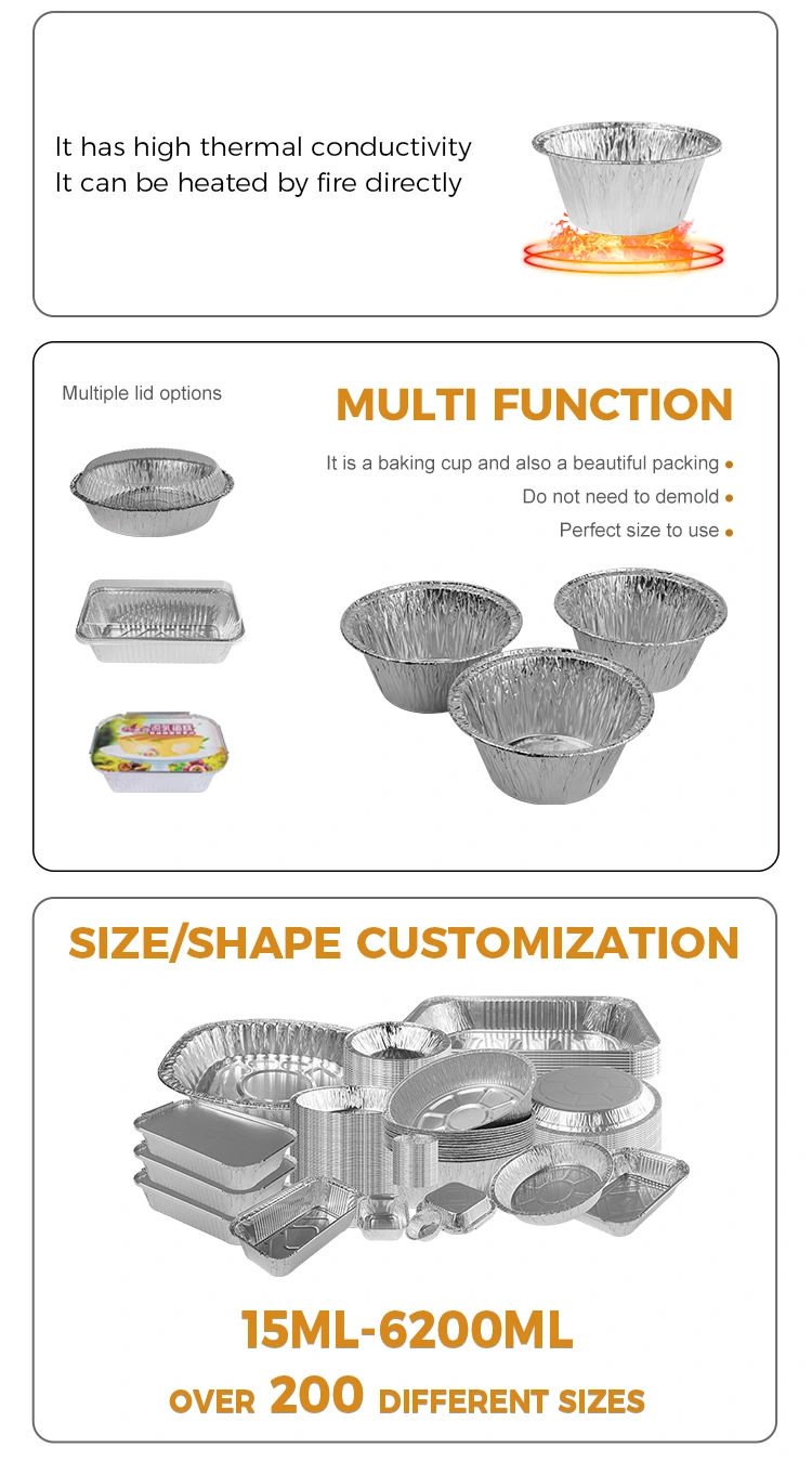 Round Bake Cake Silver Aluminium Foil Food Container tillhandahållen av Yunchu Aluminium Foil-leverantör är tillverkad av aluminiumfolie med livsmedelskvalitet. Detta material genomgår strikt kvalitetstest för att säkerställa att det är giftigt och ofarligt, kan komma i direkt kontakt med mat och uppfyller livsmedelssäkerhetsstandarder. Den måttliga tjockleken på aluminiumfolien säkerställer inte bara produktens styrka utan förbättrar också korrosionsbeständighet och förlänger dess livslängd.