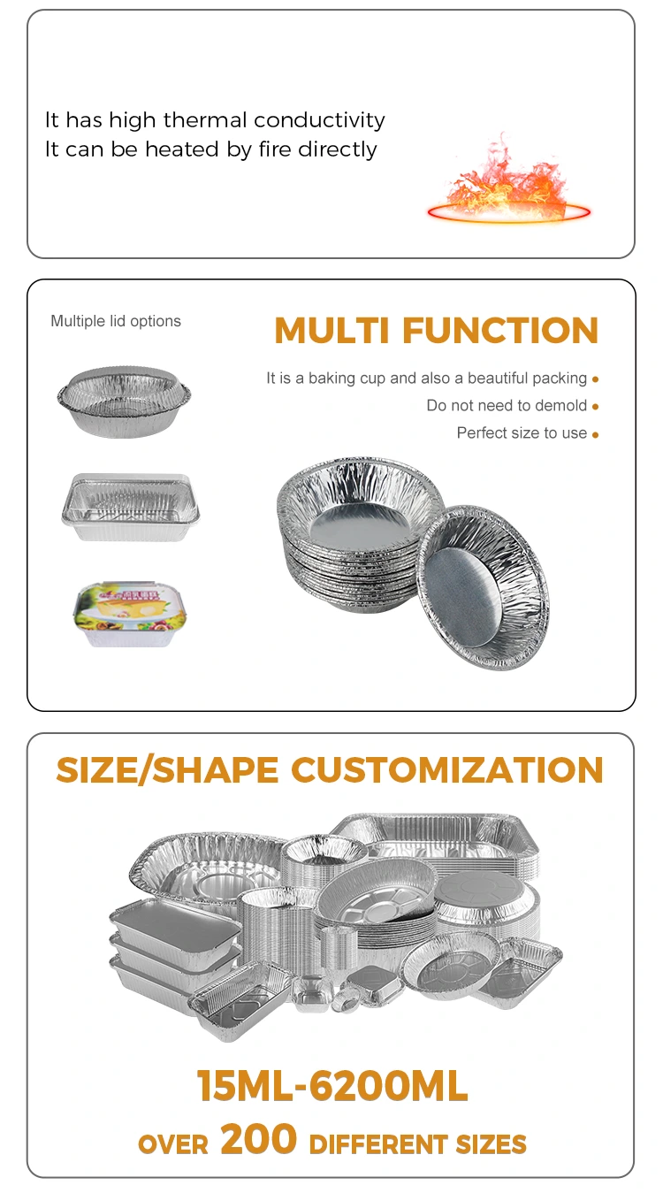 Denna runda äggtart för snacks silver aluminiumfolie matbehållare är tillverkad av 8011 matkontaktklass aluminiumfolie, vilket säkerställer säkerhet i kontakt med mat, inte lätt att deformeras och inte lätt att läcka. Tjockleken är stark, korrosionsbeständig, hög temperaturmotstånd och längre livslängd.