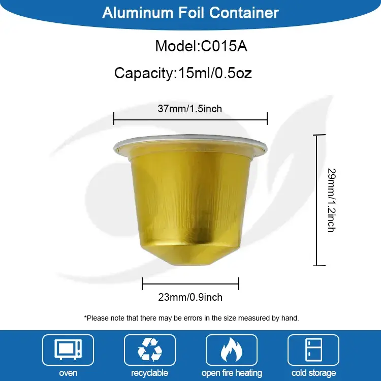Yunchu aluminiumfolieleverantör silikon-tätning tom kaffekapsel C015A i följande storlekar: översta diameter 37 mm (cirka 1,4 tum), basdiameter 23 mm (cirka 0,9 tum), höjd 29 mm (cirka 1,1 tum). Denna kapsel har 15 ml (cirka 0,5 oz) malt kaffe, kaffevätska. Lämplig för alla Nespresso -maskiner, förpackade espressomätska och kan till och med förlängas med kväve sköljning. Dessutom kan logotypen och färgen också anpassas, och mönstret kan skrivas ut på aluminiumfolie -locket, och logotypen kan också stämplas på botten av kaffekapseln.