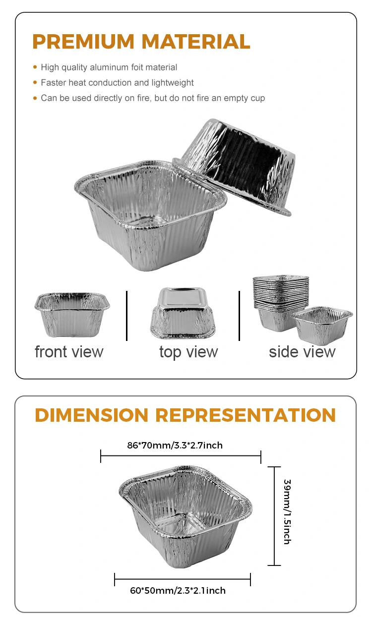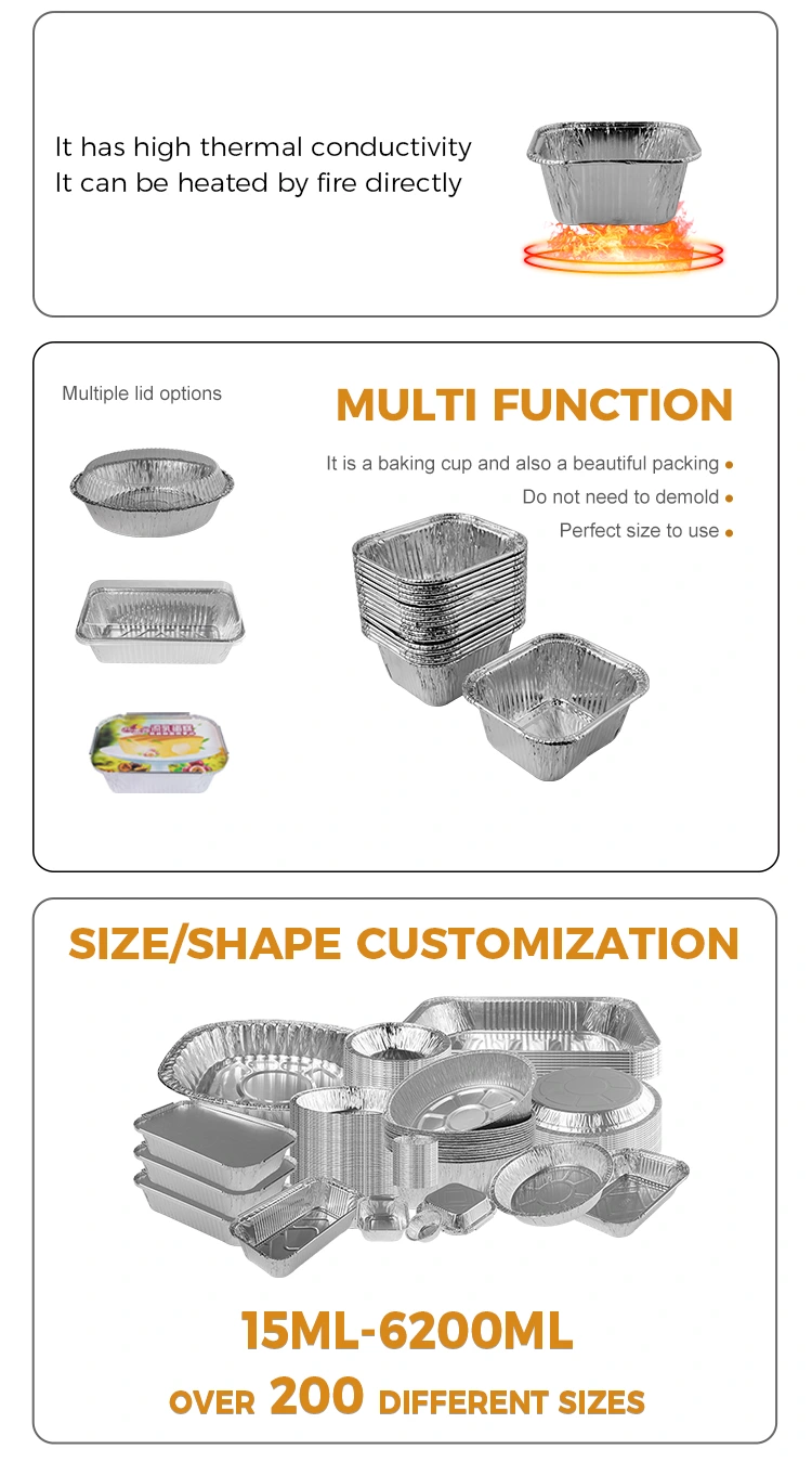 Den fyrkantiga bakpanna Air Fryer Silver Foil -behållaren som tillhandahålls av Yunchu Aluminium Foil -leverantören är lämplig för olika tillfällen, inklusive luftrum, små bakugnar, catering takeaway och cafeterior. Det är inte bara lämpligt för att göra ostron vermicelli, dessert röda bönor, grillade kycklingvingar och ångade kakor, utan kan också kopplas ihop med en mängd olika ingredienser och används allmänt i alla aspekter av cateringindustrin. Behållaren har en non-stick och anti-stick-design, med en konkav och konvex bottenstruktur som gör det lättare för mat att släppa mögel och upprätthålla ett bättre utseende. Oavsett om det är grilla eller ångar över en öppen låga, kan du enkelt hantera den utan att vara begränsad. Dess material är robust och hållbart, vilket gör det lämpligt för användning inte bara i ugnar och luftrum, utan också i öppna flamgrillar eller ångare, vilket är bekvämt och snabbt. Dessutom är behållarens yta slät och platt, och kanterna är rundade och inte lätt att repa händer, och även om det finns veck kommer det inte att påverka greppet. Vi erbjuder en mängd olika pannformer, inklusive fyrkantiga, runda och hjärtformade stilar, för att tillgodose dina olika behov. Om du är intresserad kan du gärna kontakta vår kundtjänst för mer information.