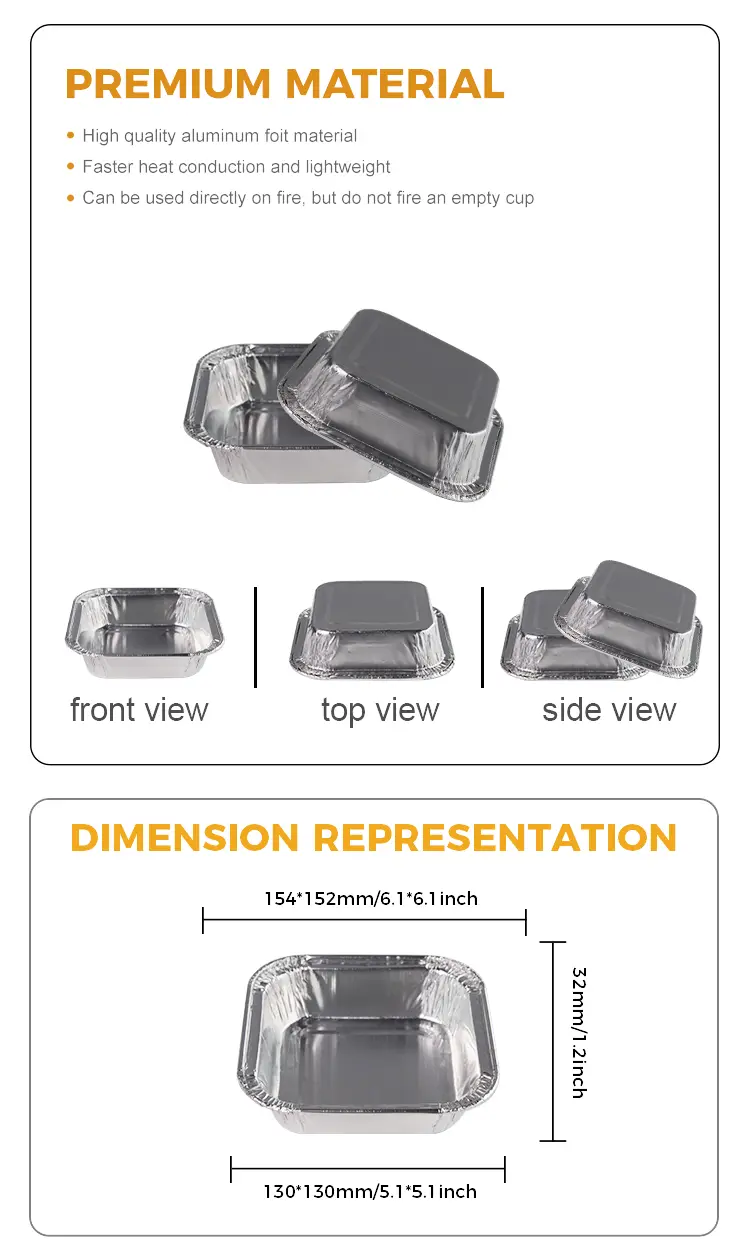 Yunchu aluminiumfolie Leverantör Square Cake Air Fryer Silver aluminiumfolie containercan kan också användas i olika scener, såsom: ugnsbakning, luft fryer, öppen flamme uppvärmning, ångare ångare och annan utrustning använder enhetlig värmeledning, enhetlig värme vid samma tid kan förhindra att peka in icke-stick, lätt att släppa mögel, etc. Foliebehållare kan användas för att baka små kakor, hemlagad yoghurt, gelépudding, bakade ägg, skaldjur och andra livsmedel, botten konkava och konvex design, spela en halkfritt roll, den helt krullade kantdesignen kan användas med ett husdjur helt transparent lock för att låsa in temperaturen och den läckerheten i maten.