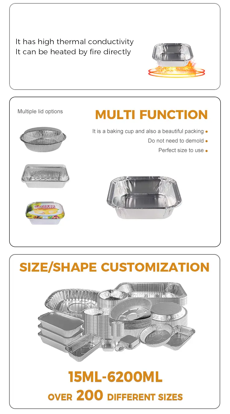 Funktioner: Lunch Box grossist tillverkad av aluminiumfolie för matkvalitet, säkert och friskt utan rengöring, lätt att baka och applicera på en gång, kasta bort utan börda när den används, kan direkt kontakta mat, vattentät och oljesäker, förtjockad och fördjupad, hög temperaturbeständighet, hålla mat färskt och läckert.